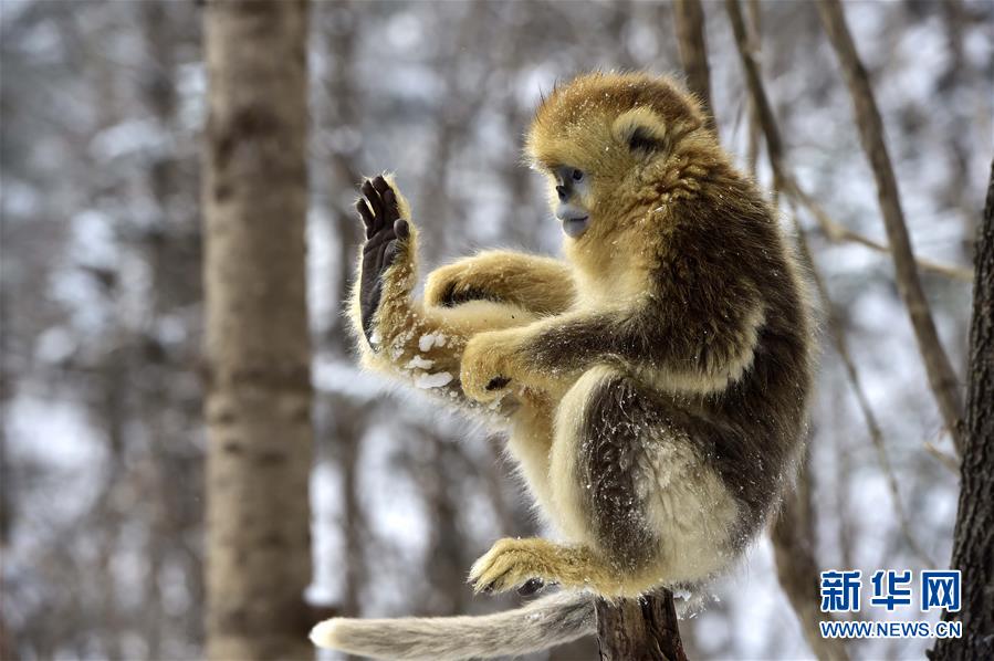 神农架野生金丝猴雪趣