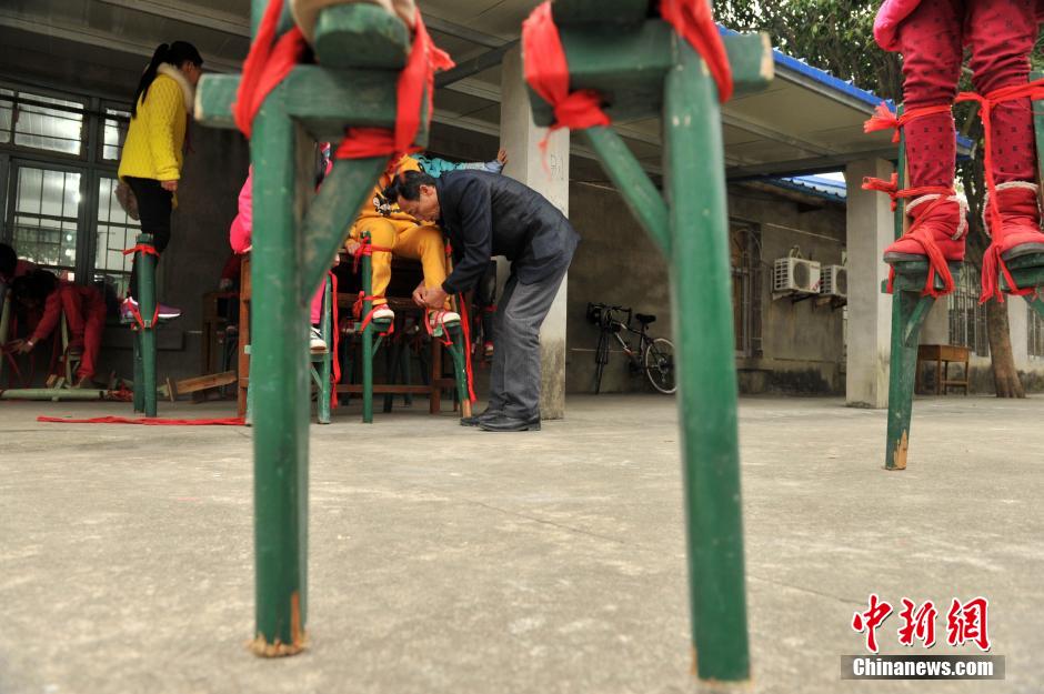 年过六旬的王建民,退休前在福州的一所小学内担任保安。退休后,有着近20年高跷艺术演出经验的他并没有闲下来,而是重新走进了校园内为孩子们授课,并组成了一组小学高跷队,传承这“高人一等”的绝活。1月13日,记者来到了福州赤桥小学了解这个特色校本课程。图为王建民帮学生将木跷绑牢。吕明 摄