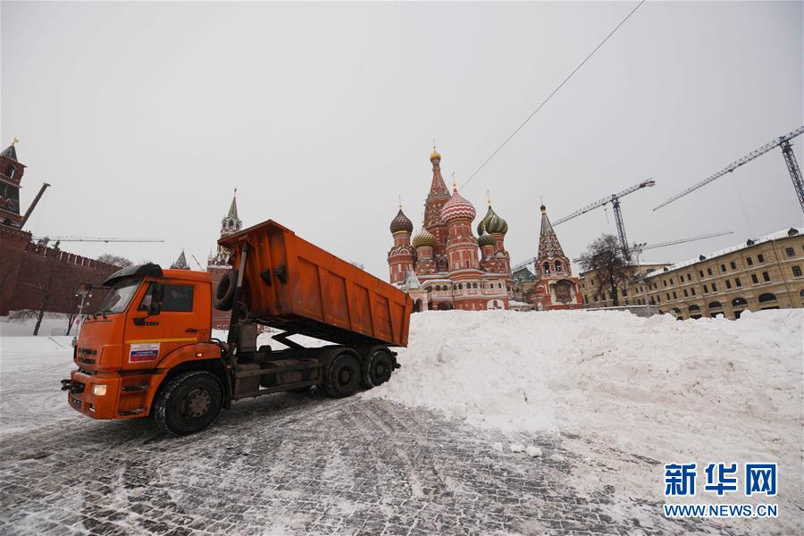 1月13日,在俄罗斯首都莫斯科,一辆除雪车在运送积雪。俄罗斯首都莫斯科自12日下午起突降大雪,在不到一昼夜的时间里积雪量达24厘米。 新华社记者戴天放摄