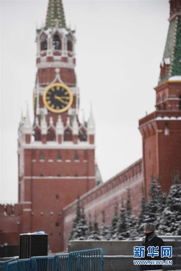1月13日,在俄罗斯首都莫斯科,一名士兵在克里姆林宫外站岗。俄罗斯首都莫斯科自12日下午起突降大雪,在不到一昼夜的时间里积雪量达24厘米。 新华社记者戴天放摄