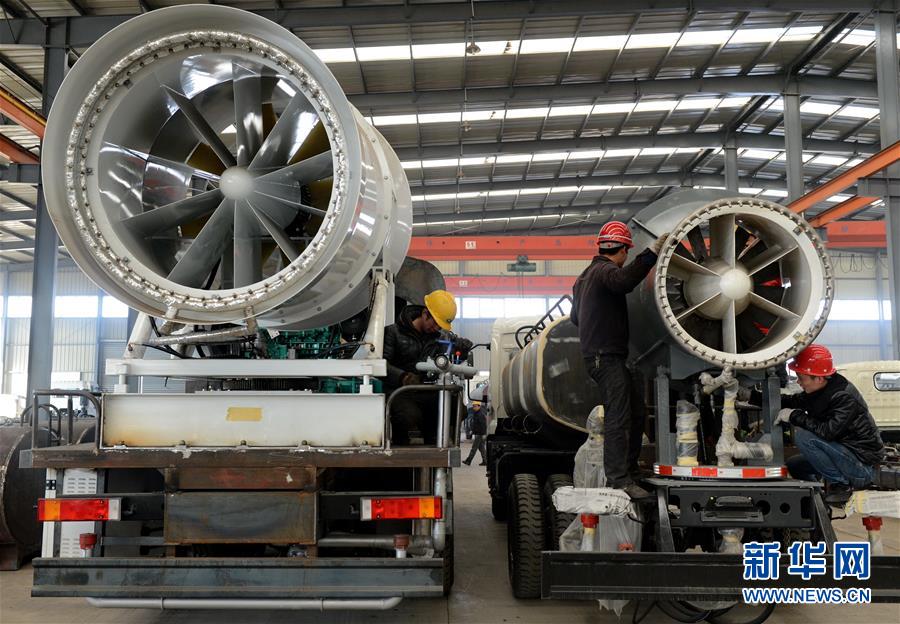 1月13日,河北远达车辆制造有限公司工人在车间内装配“雾炮车”。近日,位于河北省肥乡县的河北远达车辆制造公司正加紧生产环保除尘风送式喷雾机(又叫“雾炮车”),喷雾机安装在环卫车辆的后半部分,利用风机将水雾喷洒出去,达到抑制扬尘、净化空气的效果。新华社记者 牟宇 摄