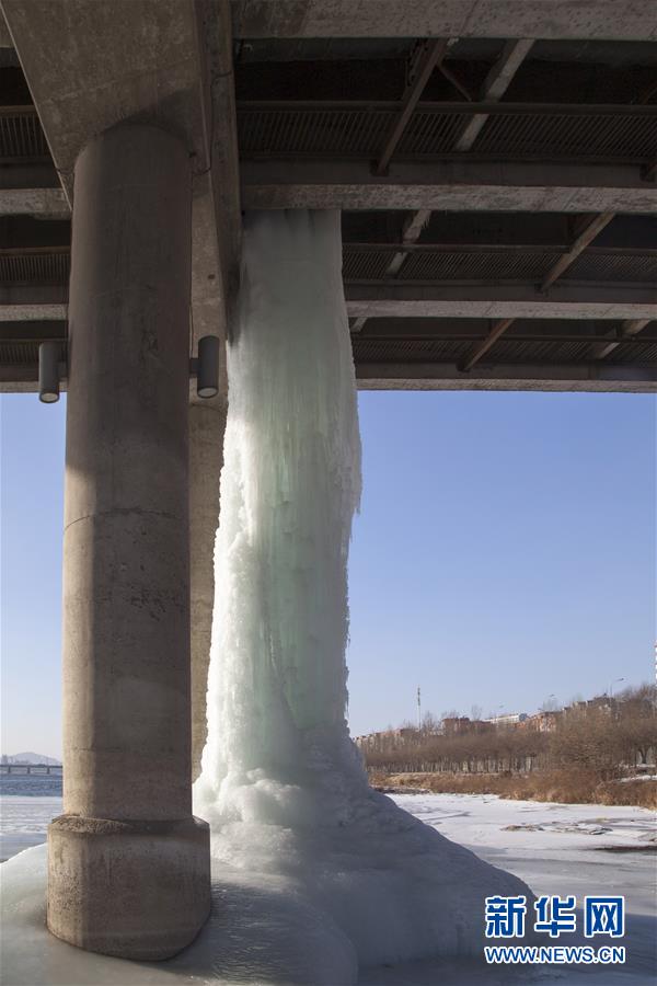 这是1月14日在吉林市清源大桥下拍摄的冰柱。近日,吉林省吉林市横跨松花江的清源大桥下出现一根巨大的冰柱,冰柱直径约1米,从桥面连接江面。 新华社发