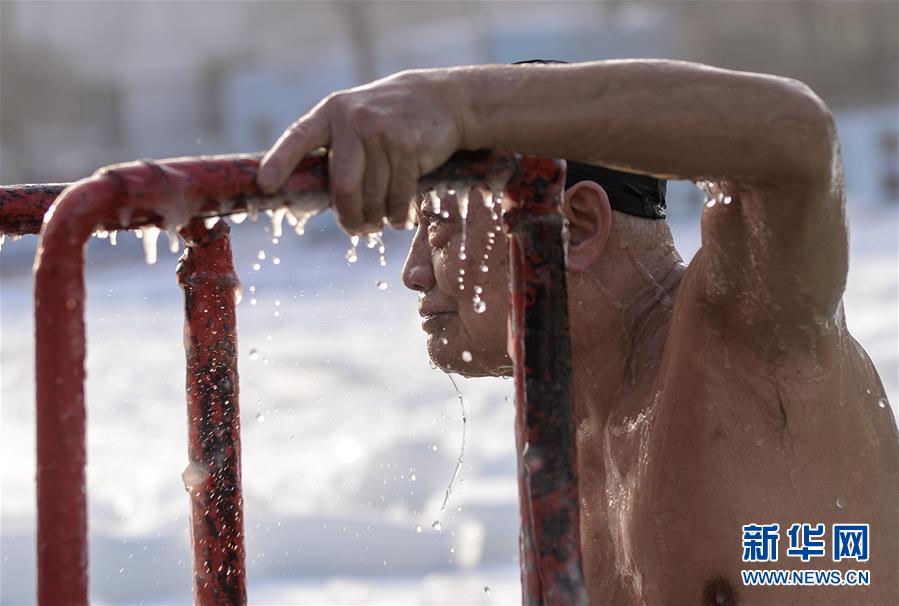 图为在乌鲁木齐红山游泳馆室外泳池,78岁的冬泳爱好者梁富生准备上岸(1月13日摄)。 新华社记者王菲摄