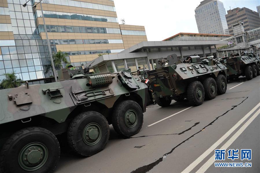1月14日,在印度尼西亚首都雅加达,装甲车聚集在爆炸现场。印度尼西亚首都雅加达14日上午发生数起爆炸,造成至少7人死亡。警方同武装分子发生交火。印尼总统佐科对这种“恐怖行为”表示谴责。新华社记者贺长山摄