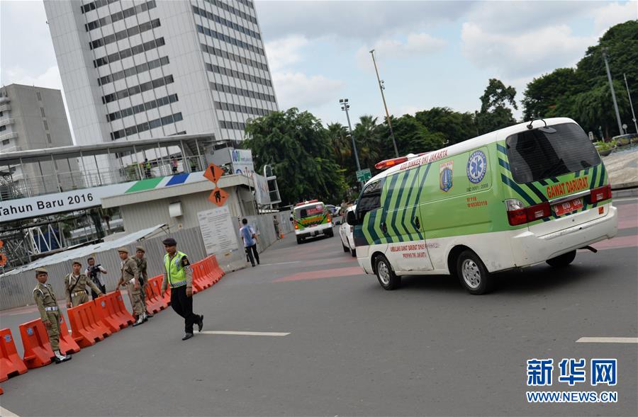 1月14日,在印度尼西亚首都雅加达,警察在爆炸现场附近戒严。