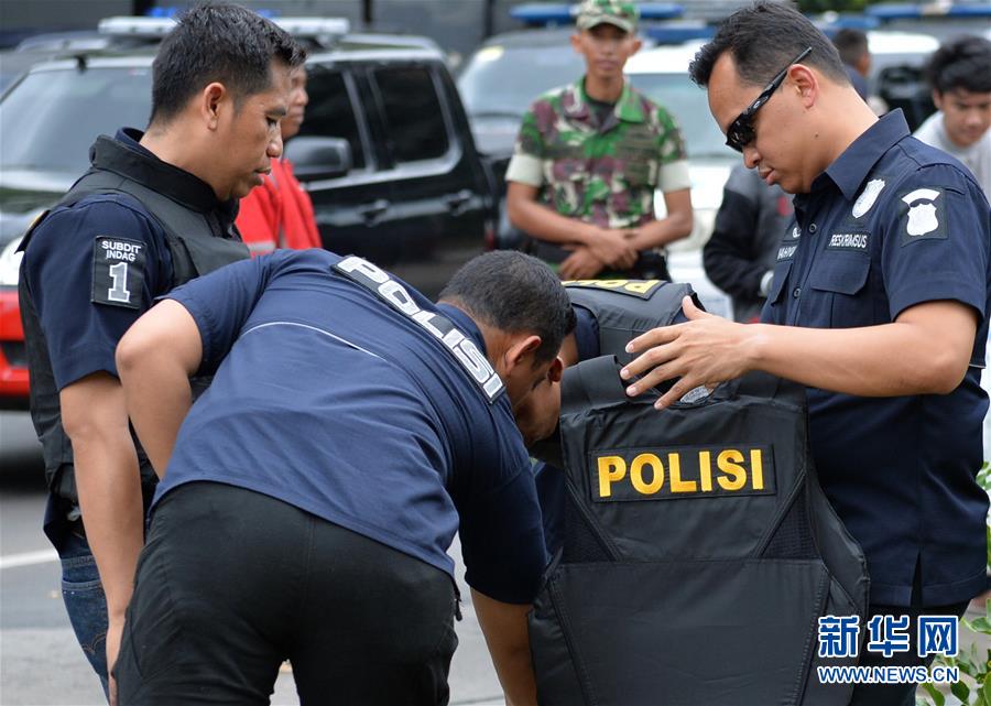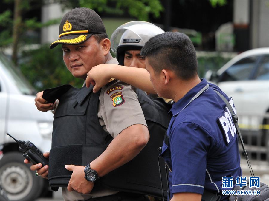 1月14日,在印度尼西亚首都雅加达,警察聚集在爆炸现场分发防弹衣。
