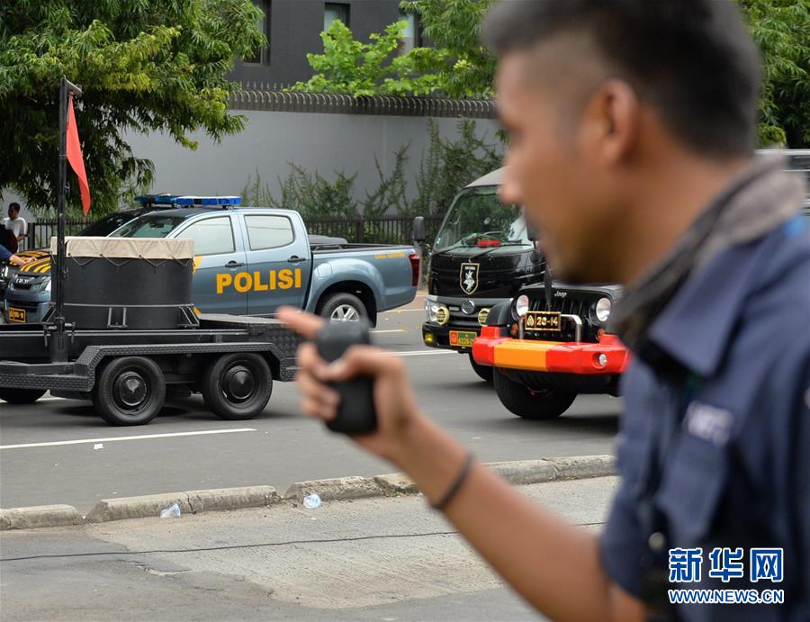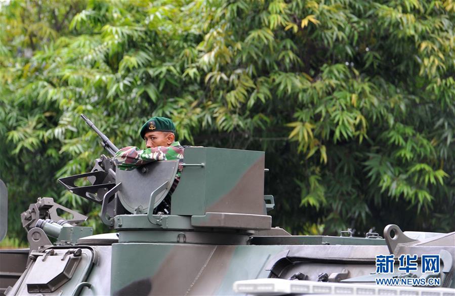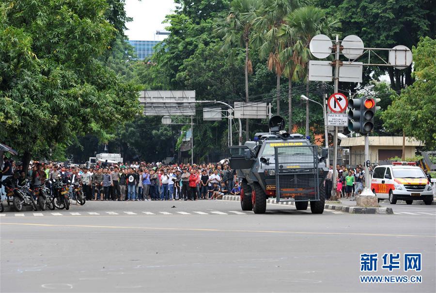 1月14日,在印度尼西亚首都雅加达,特警在爆炸现场的装甲车上警戒。