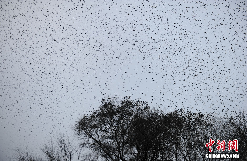 1月20日, 济南趵突泉上空上万只鸟儿正在翱翔。连日来,济南趵突泉公园聚集上万只鸟儿在此飞翔栖息,吸引游客纷纷驻足观望。