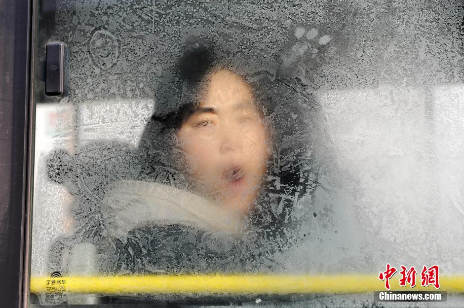 1月20日,辽宁沈阳,一位女乘客向凝结出冰花的车窗呵气。当日是大寒节气,辽宁大部分地区气温持续走低,抚顺地区及西丰最低气温达到零下28℃。伴随一股西伯利亚“霸王级”寒潮来临,中国大部地区将在本周进入一年中最冷时期。中新社记者 孙昊声 摄