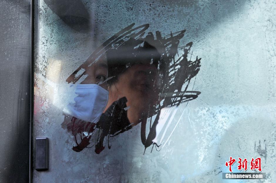 1月20日,辽宁沈阳,一位女乘客透过被冰花封住的车窗向外张望。当日是大寒节气,辽宁大部分地区气温持续走低,抚顺地区及西丰最低气温达到零下28℃。伴随一股西伯利亚“霸王级”寒潮来临,中国大部地区将在本周进入一年中最冷时期。中新社记者 孙昊声 摄