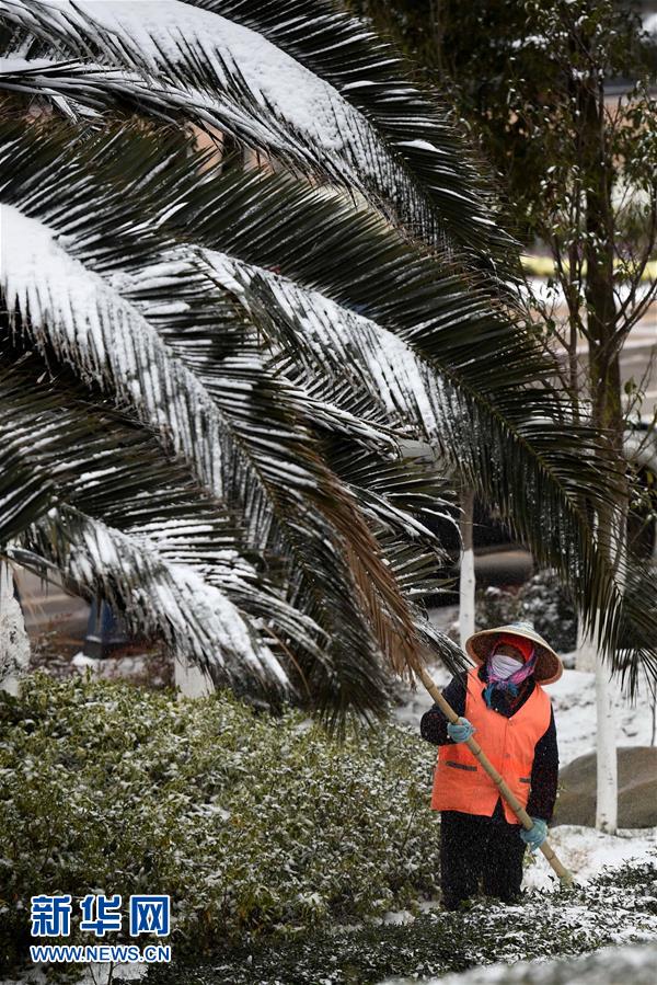 1月24日,一名环卫工人在昆明滇池大坝旁清理树上的积雪。 1月23日和24日,受北方强冷空气影响,地处我国西南边陲的“春城”昆明遭遇降雪天气,最高气温较几天前的18摄氏度大幅下降至1摄氏度,最低气温仅有零下3摄氏度。针对当前强寒潮天气,云南省气象局1月23日12时已将重大气象灾害(雨雪、冰冻、寒潮)Ⅳ级应急响应提升为Ⅲ级应急响应。新华社记者 蔺以光 摄