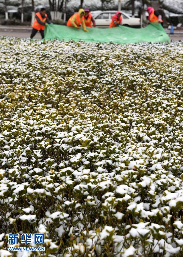 1月24日,一些环卫工人在昆明滇池大坝旁清理积雪。 1月23日和24日,受北方强冷空气影响,地处我国西南边陲的“春城”昆明遭遇降雪天气,最高气温较几天前的18摄氏度大幅下降至1摄氏度,最低气温仅有零下3摄氏度。针对当前强寒潮天气,云南省气象局1月23日12时已将重大气象灾害(雨雪、冰冻、寒潮)Ⅳ级应急响应提升为Ⅲ级应急响应。新华社记者 蔺以光 摄