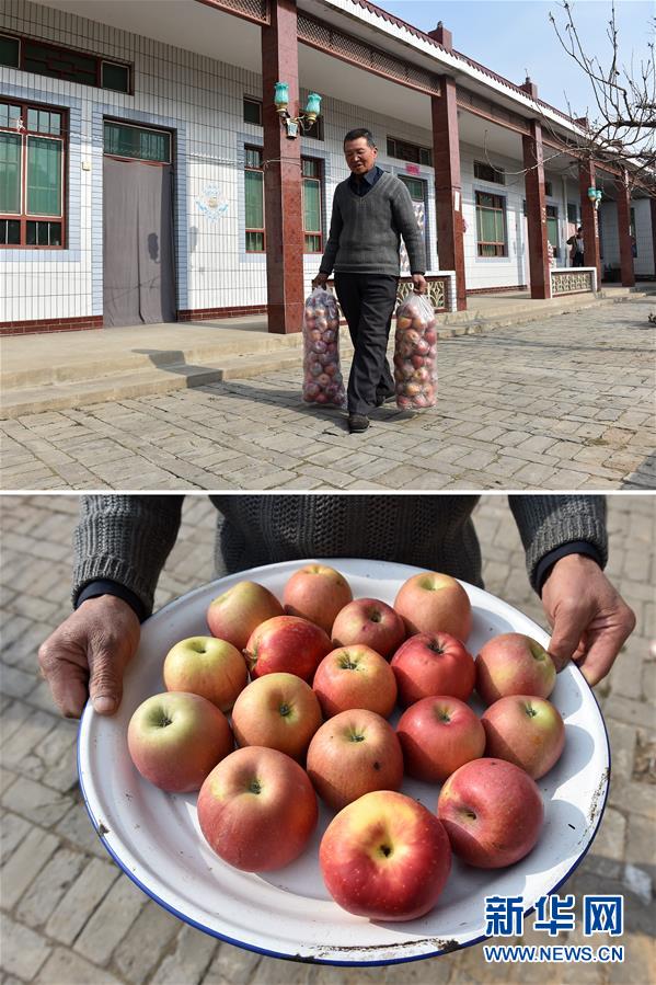 上图:今年65岁的山西平陆县杜马乡杜村村民郑贞祥从冷库里把苹果拿出来;下图:郑贞祥给孩子准备的苹果(拼版照片,1月21日摄)。郑贞祥种了5亩苹果、2亩桃,2015年收入近5万元。他的三个儿子都在外打工。老人说,自家种的苹果孩子最爱吃,这两天再去集市上把鱼、肉、菜买了,就等着孩子们回家过年了。位于中条山南麓的山西平陆县杜马乡,山高坡陡、环境恶劣,“靠天吃饭”一直是制约该乡发展的“瓶颈”。近年来,在当地政府指导下,该乡将农民技能培训列为精准扶贫项目,针对45岁以上村民进行果农技术培训,45岁以下村民进行电工、烹调等实用型技术培训,帮助村民跳“穷窝”,拔“穷根”。乡里老人种植苹果、枣树等经济作物,年轻人农闲时外出务工,村民们逐步走上了致富的道路。春节将至,杜马乡里生活越来越好的老人们开始用心置办年货,等待着在外打拼的儿女回家过年团聚。 新华社记者 詹彦 摄