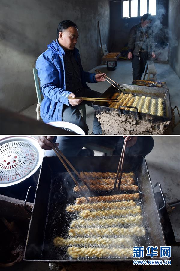 上图:今年52岁的山西平陆县杜马乡杜村村民赵普选在炸麻花;下图:赵普选在加工麻花(拼版照片,1月21日摄)。赵普选种了10亩梨、5亩桃,2015年收入5万多元。赵普选的女儿在外工作,儿子在上大学。他说,杜村到了快过年的时候有炸麻花的传统,孩子们也爱吃,别的东西等孩子们回来了爱吃什么再去买。位于中条山南麓的山西平陆县杜马乡,山高坡陡、环境恶劣,“靠天吃饭”一直是制约该乡发展的“瓶颈”。近年来,在当地政府指导下,该乡将农民技能培训列为精准扶贫项目,针对45岁以上村民进行果农技术培训,45岁以下村民进行电工、烹调等实用型技术培训,帮助村民跳“穷窝”,拔“穷根”。乡里老人种植苹果、枣树等经济作物,年轻人农闲时外出务工,村民们逐步走上了致富的道路。春节将至,杜马乡里生活越来越好的老人们开始用心置办年货,等待着在外打拼的儿女回家过年团聚。 新华社记者 詹彦 摄