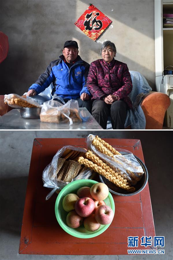 上图:现年70岁的山西平陆县杜马乡杜村村民郑章纪和70岁的老伴赵点花坐在沙发上;下图:老两口给孩子准备的麻花、苹果和饼干(拼版照片,1月21日摄)。郑章纪家种了3亩多苹果,卖了2万多元。郑章纪的两个儿子都在太原打工。老人说,现在集市上什么都有,先随便买点,等孩子们回来了再一起去买别的。位于中条山南麓的山西平陆县杜马乡,山高坡陡、环境恶劣,“靠天吃饭”一直是制约该乡发展的“瓶颈”。近年来,在当地政府指导下,该乡将农民技能培训列为精准扶贫项目,针对45岁以上村民进行果农技术培训,45岁以下村民进行电工、烹调等实用型技术培训,帮助村民跳“穷窝”,拔“穷根”。乡里老人种植苹果、枣树等经济作物,年轻人农闲时外出务工,村民们逐步走上了致富的道路。春节将至,杜马乡里生活越来越好的老人们开始用心置办年货,等待着在外打拼的儿女回家过年团聚。 新华社记者 詹彦 摄