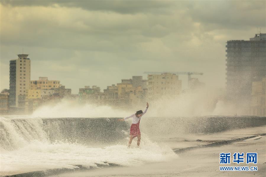 1月23日,在古巴首都哈瓦那的海堤上,一名女子被巨浪打湿衣衫。当天,新一轮寒潮登陆古巴西北部,导致部分地区海水倒灌并形成内涝。 新华社记者 刘彬 摄