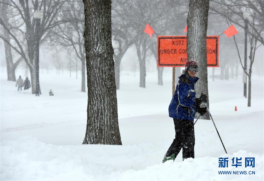 1月23日,一名男子在美国首都华盛顿宪法大道上滑雪。当日,袭击美国东部地区的暴风雪仍在继续。首都华盛顿市区的街道上行人稀少,但仍有一些人到街上滑雪、跑步,雪中作乐。 新华社记者 殷博古摄