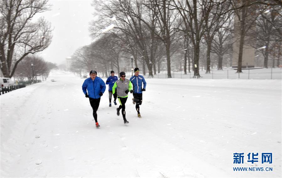1月23日,在美国华盛顿国会山,几名年轻人冒雪跑步。当日,袭击美国东部地区的暴风雪仍在继续。首都华盛顿市区的街道上行人稀少,但仍有一些人到街上滑雪、跑步,雪中作乐。 新华社记者 殷博古摄