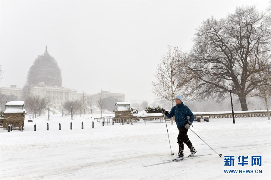 1月23日,一名女子在美国首都华盛顿国会山滑雪。当日,袭击美国东部地区的暴风雪仍在继续。首都华盛顿市区的街道上行人稀少,但仍有一些人到街上滑雪、跑步,雪中作乐。 新华社记者 殷博古摄