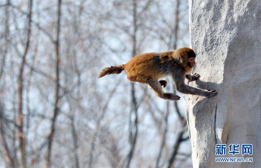 1月24日,在呼和浩特市大青山野生动物园,一只猕猴“飞檐走壁”。寒潮来袭,生活在内蒙古呼和浩特市大青山动物园的猴子在园里各显神通,萌态十足。 新华社发(王正 摄)