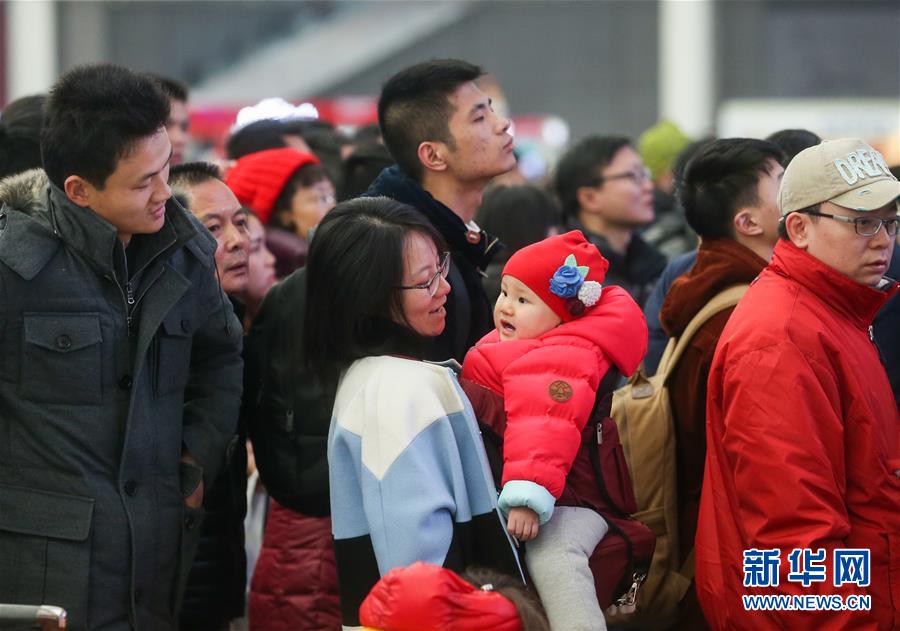 1月24日,一位旅客抱着孩子在上海虹桥火车站内排队上车。当日,为期40天的2016年春运正式拉开大幕。许多孩子在大人的呵护下也踏上旅途,成为春运大潮中一道别样的风景。据交通运输部预测,预计全国旅客发送量将达到29.1亿人次、同比增长3.6%。新华社记者 丁汀摄