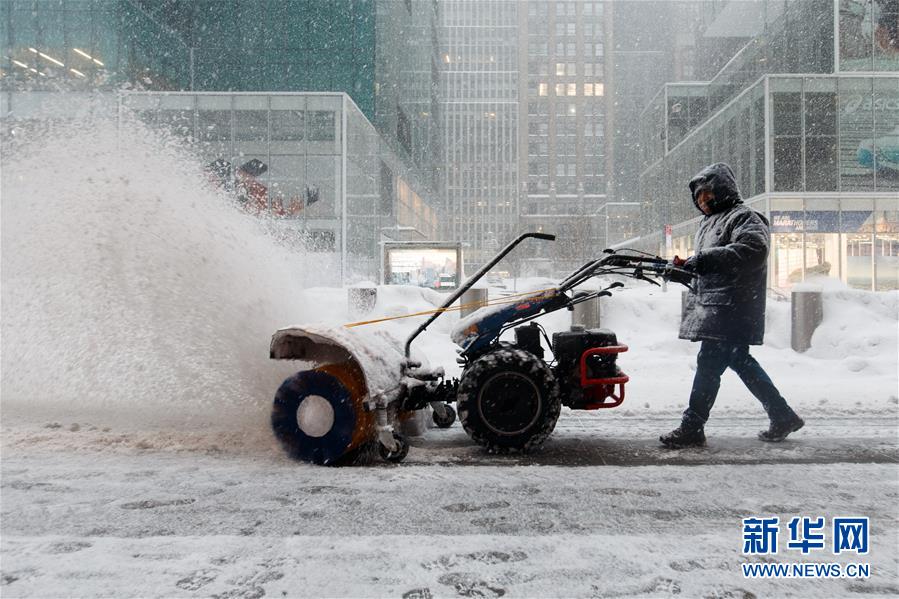 1月23日,在美国纽约曼哈顿,一名男子清除人行道上的积雪。暴风雪自22日晚起袭击美国东北部,纽约州州长安德鲁·科莫23日宣布该州进入紧急状态,呼吁居民留在家里不要外出。综合纽约、新泽西等地交通主管部门消息,鉴于路面状况差和能见度低,纽约市暂停了所有公共汽车服务,将根据天气情况决定何时重新运行。新华社记者李木子摄
