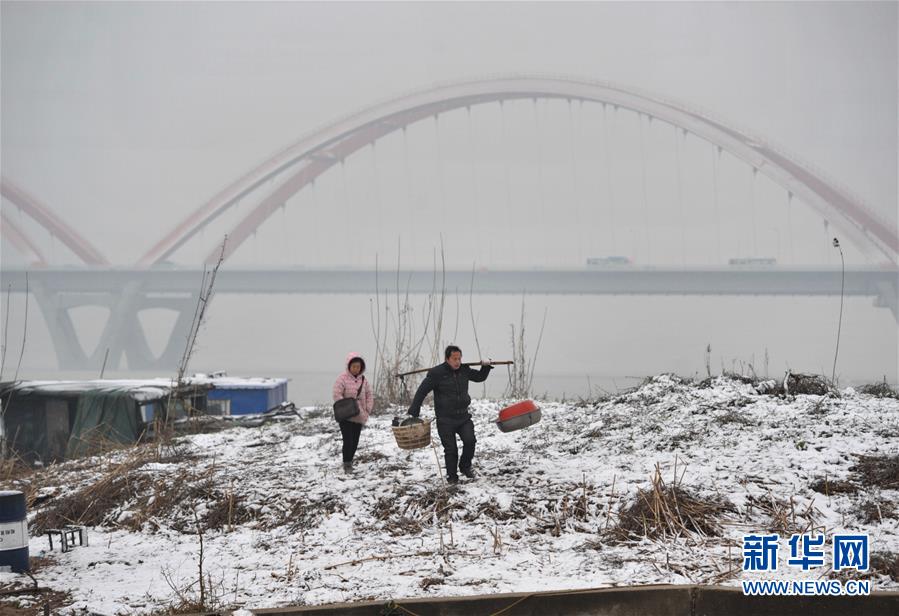 2月1日,长沙居民在福元路大桥附近湘江河滩冒雪出行。2月1日,受强冷空气影响,湖南长沙迎来降雪天气,市区能见度低,居民出行受到影响。据气象部门预计,随着冷空气南下,长沙1至2日有中到大雪,最低气温将降至1摄氏度。新华社记者 龙弘涛 摄