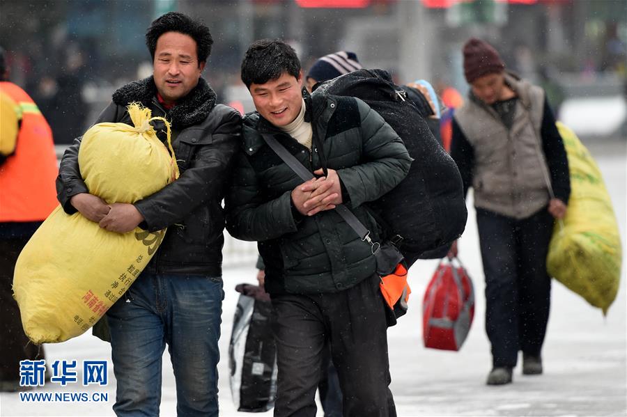 1月30日,旅客带着行李在郑州火车站进站口准备进站乘车。当日,河南大部分地区普降小雪,气温降低,在郑州火车站站前广场,旅客们冒着小雪进站乘车。 新华社记者 李博 摄