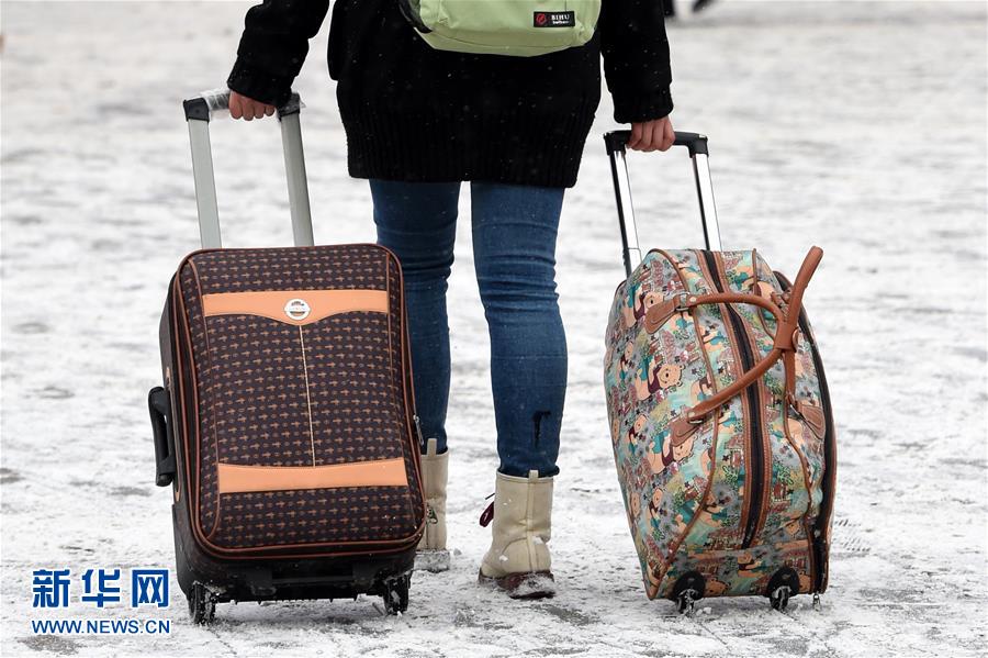 1月30日,一位旅客带着行李在郑州火车站进站口准备进站乘车。当日,河南大部分地区普降小雪,气温降低,在郑州火车站站前广场,旅客们冒着小雪进站乘车。 新华社记者 李博 摄