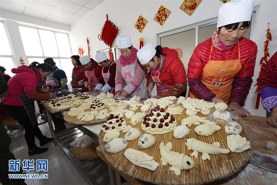 1月30日,在山东省日照市莒县浮来山镇田家店子村老年公寓,村民们在制作花馍。春节临近,人们开始加紧准备年货,各地张灯结彩,到处洋溢着节日的气息。 新华社发(陈为峰 摄)
