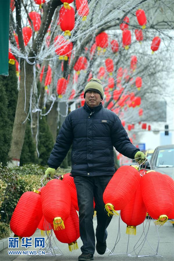 1月30日,在山东省聊城市东昌东路,工作人员在路边悬挂红灯笼。春节临近,人们开始加紧准备年货,各地张灯结彩,到处洋溢着节日的气息。 新华社发(赵玉国 摄)