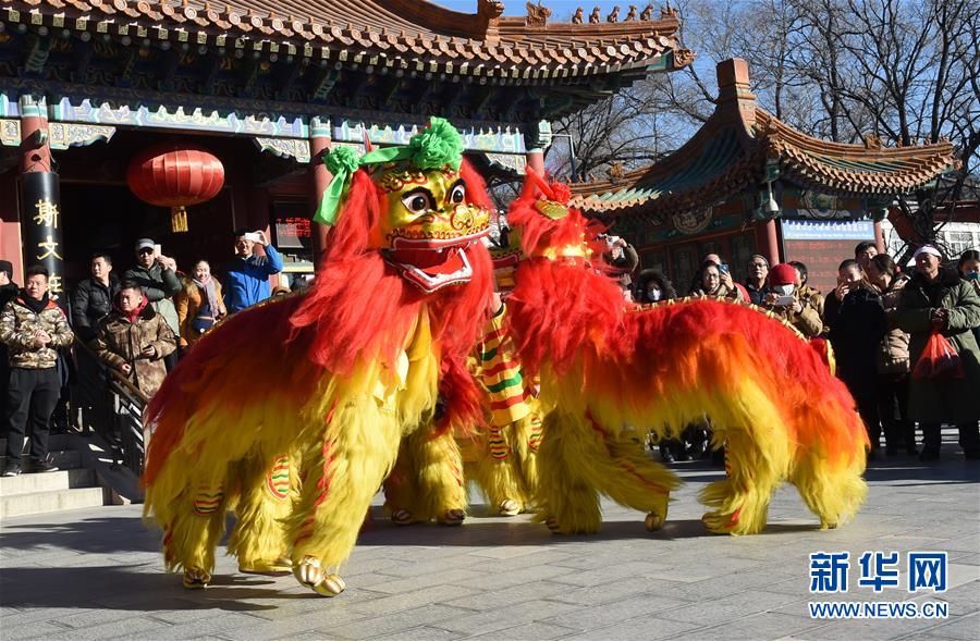 2月1日,北京民间艺人进行舞狮子表演。当日,即将在2016年2月8日(大年初一)开幕的北京八大处公园新春庙会进行传统民俗文艺彩排,13档北京民间花会表演队伍进行展演,再现老北京花会祈福走会的盛大场景。新华社记者 李俊东 摄