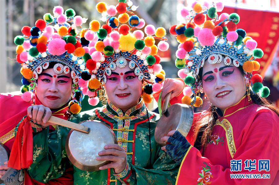2月1日,北京左安门外红寺村太平同乐秧歌圣会的民间艺人进行表演。当日,即将在2016年2月8日(大年初一)开幕的北京八大处公园新春庙会进行传统民俗文艺彩排,13档北京民间花会表演队伍进行展演,再现老北京花会祈福走会的盛大场景。新华社记者 李俊东 摄