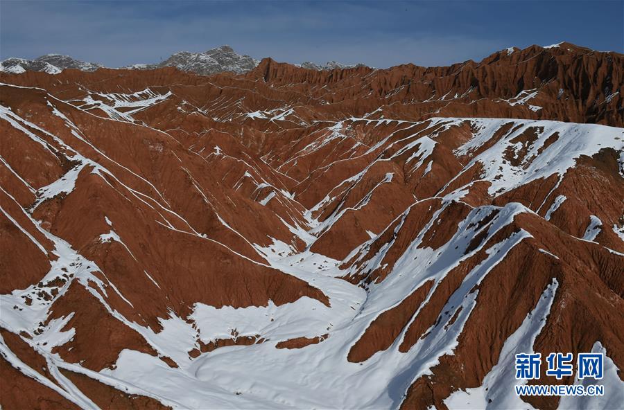 2月2日拍摄的吐鲁番火焰山落雪景观。火焰山横卧于新疆吐鲁番盆地,盛夏酷热似火,冬季披上“银装”后一派别样景致。 新华社发(刘健 摄)