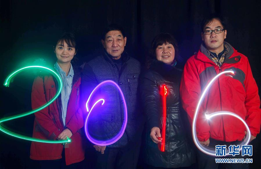 江苏南通的龚丹一家用荧光棒写下“2016”,以这张特别的全家福表达对新春的祈盼和祝福(1月29日摄)。新华社发(黄哲 摄)