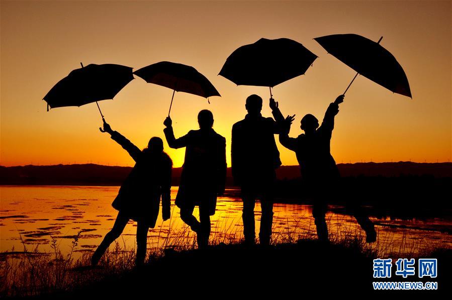 贵州省威宁县的陈大杰(右二)一家在湿地旁拍摄的“剪影”全家福(1月29日摄)。 新华社发(杨文斌 摄)