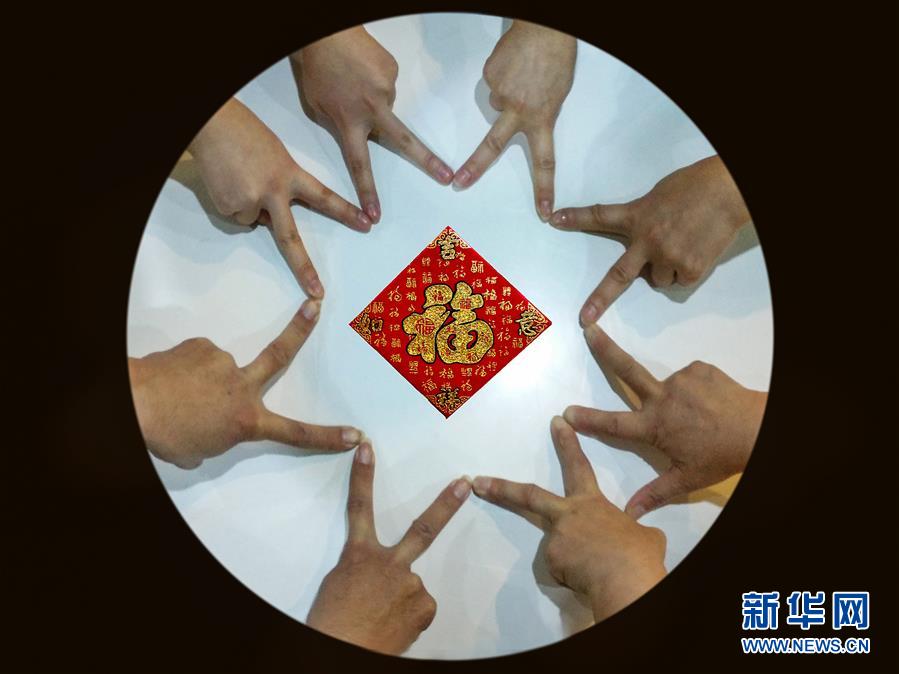 浙江宁波的虞先生一家四口人用双手围绕“福”字拍摄的“全家福”(1月31日摄)。 新华社发(胡学军 摄)