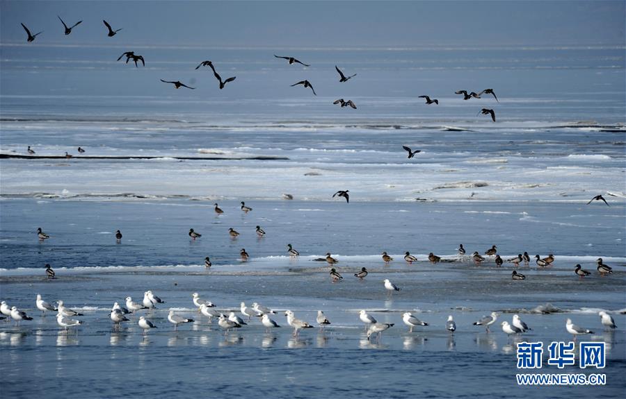 2月3日,海鸥、野鸭等禽鸟在辽宁省大连市金州湾海域的冰面上栖息和飞翔。新华社发(吕文正 摄)