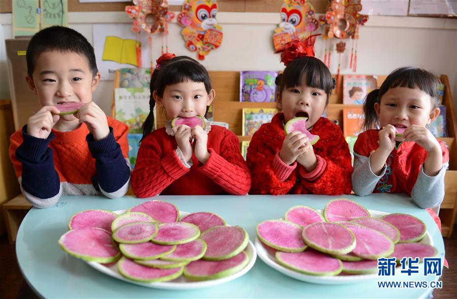 2月3日,石家庄市新华区淘宝贝南海幼儿园的小朋友吃生萝卜“咬春”。