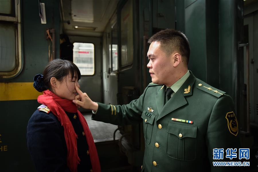 2月3日,在广州东站的月台上,樊鼎为妻子雷云拭去脸上的泪花。