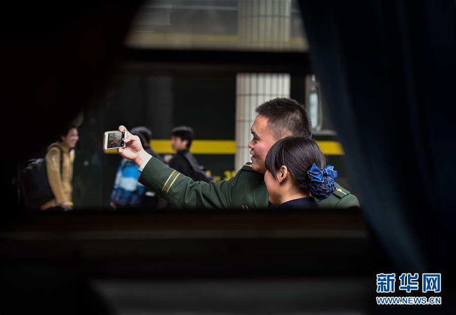 2月3日,在广州东站的月台上,樊鼎掏出手机和妻子雷云在列车旁自拍合照。