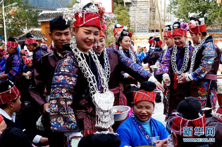 在贵州台江县老屯乡长滩村,新娘新郎答谢前来参加婚礼的客人(2月12日摄)。长滩村位于贵州省黔东南苗族侗族自治州台江县老屯乡境内,现居住着200多户1000多名村民。这里的苗族村民世世代代与周边各族群众和谐共处。2013年,长滩村凭借其原汁原味的传统村落文化、优美的田园山水风光,入选第二批“中国传统村落”。新春佳节期间,长滩村苗族村民举行包括传统特色婚礼在内的各类民俗活动,让来自四面八方的游客充分感受苗乡传统文化。新华社记者 潘旭 摄
