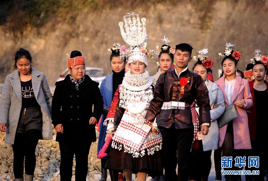 在贵州台江县老屯乡长滩村,一对新人与迎亲队伍走在赴婚礼的路上(2月12日摄)。长滩村位于贵州省黔东南苗族侗族自治州台江县老屯乡境内,现居住着200多户1000多名村民。这里的苗族村民世世代代与周边各族群众和谐共处。2013年,长滩村凭借其原汁原味的传统村落文化、优美的田园山水风光,入选第二批“中国传统村落”。新春佳节期间,长滩村苗族村民举行包括传统特色婚礼在内的各类民俗活动,让来自四面八方的游客充分感受苗乡传统文化。新华社记者 潘旭 摄