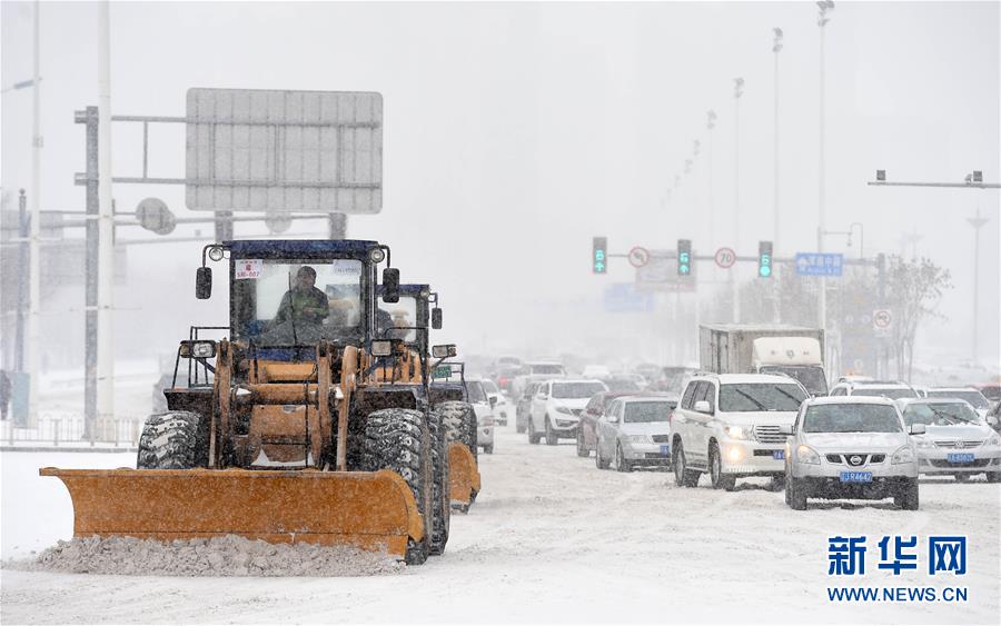 2月13日,铲车在沈阳街头进行除雪作业。春节假期最后一天,辽宁迎来农历猴年首场强降雪,境内大部分高速公路封闭,节日返程交通严重受阻。据气象部门预计,降雪对交通的影响将延续至14日。新华社记者 李钢 摄