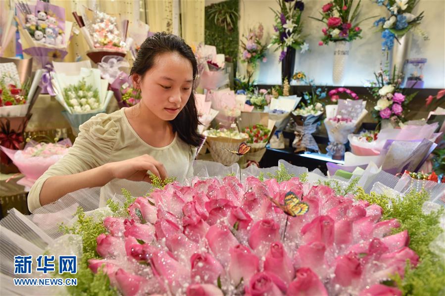2月13日,在福州市中心的一家花店,工作人员在打理装饰有蝴蝶的创意情人节花束。西方情人节将至,各地鲜花紧俏,不少花店提前备货,并推出一些独特的造型和包装,吸引顾客前来消费。 新华社记者宋为伟摄