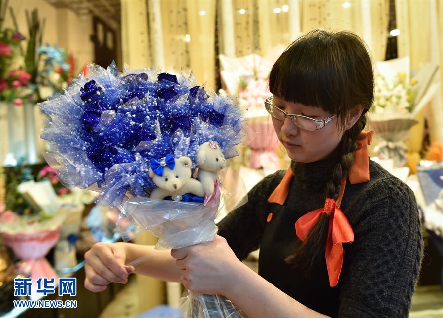 2月13日,在福州市中心的一家花店,工作人员在包装情人节鲜花。西方情人节将至,各地鲜花紧俏,不少花店提前备货,并推出一些独特的造型和包装,吸引顾客前来消费。 新华社记者宋为伟摄
