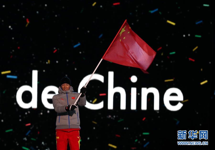2月12日,中国代表团旗手朱朕宇在开幕式上挥舞五星红旗。 当日,2016冬季青年奥林匹克运动会在利勒哈默尔开幕。 新华社记者韩岩摄