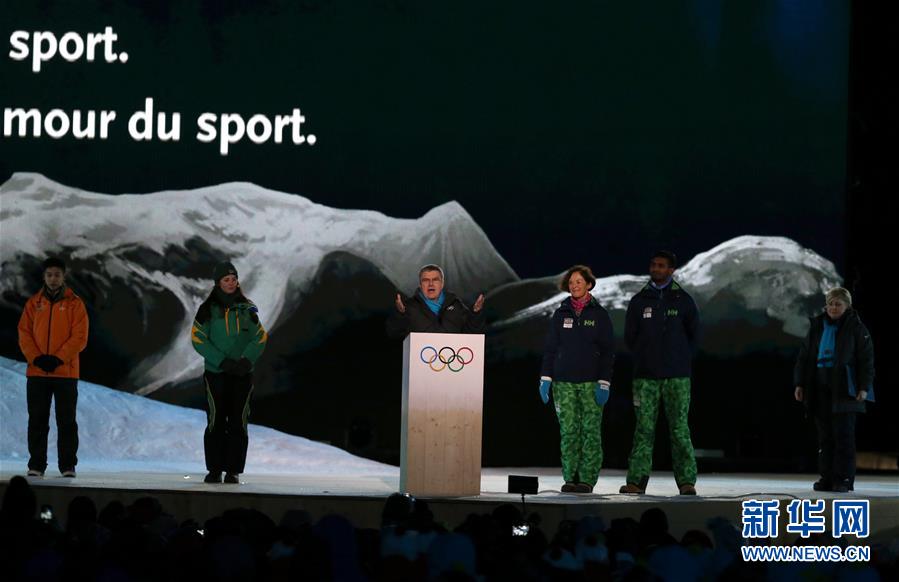 2月12日,国际奥委会主席巴赫(中)在开幕式上致辞。 当日,2016冬季青年奥林匹克运动会在利勒哈默尔开幕。 新华社记者韩岩摄