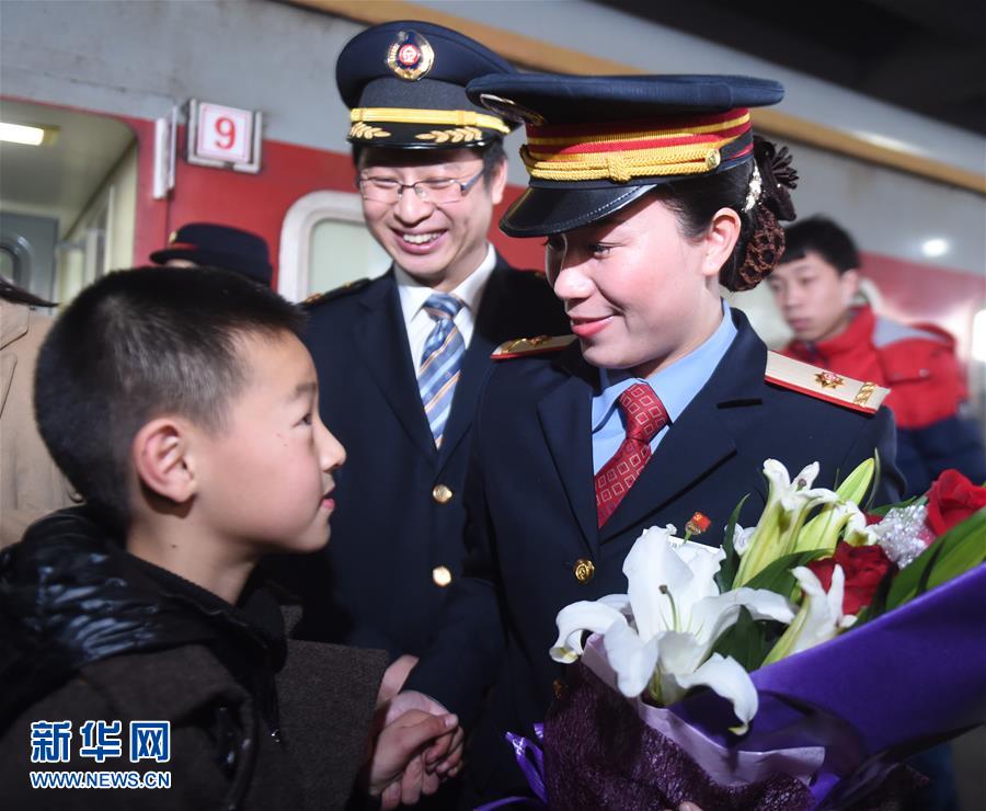 2月13日,K210次列车进站后,李子炫与爸爸、妈妈在站台短暂团圆。新华社记者 韩传号 摄