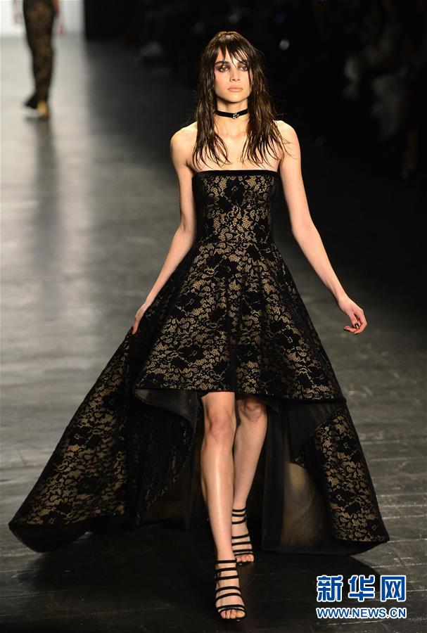 2月12日,模特在纽约时装周的庄司正(Tadashi Shoji)新品发布会上走秀。 当天,2016年纽约秋冬时装周进入第二天。 新华社记者王雷摄
